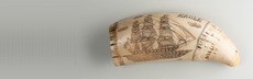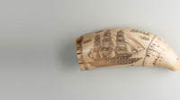 Als Scrimshaw werden mit Gravur- oder Reliefverzierungen versehene Walzähne bezeichnet. Das Röntgenbild lässt erkennen, dass dieses Stück ein Imitat und sogenanntes ‚Fakeshaw‘ ist. Es zeigt als Hauptmotive das amerikanische Walfangschiff EAGLE und die personifizierte Freiheit – LIBERTY – als Frauengestalt mit historischer US-Flagge und einem Anker. Des Weiteren sind zwei Harpunen, ein Pottwal sowie die Initialen „J.A.“ eingraviert. Heute ist der Handel mit neuen Pottwalzähnen durch internationale Gesetze strikt begrenzt.